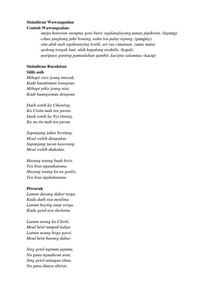 Sisindiran piwuruk anu wangunna rarakitan ka pasar rék meuli salak,. Contoh rarakitan 30+ sisindiran silih asih, piwuruk, sesebred. Piwuruk sepuh (nasihat orang tua), piwuruk guru (nasihat guru). Nov 09, 2020 · contoh paparikan: Sisindiran adalah bentuk puisi lama dalam bahasa sunda yang terdiri dari sampiran dan isi.