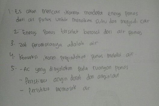 Es batu mencair karena mendapatkan panas. Apakah zat perantara pada percobaan ini? Es batu mencair karena mendapatkan panas. Jika kedua panci berisi air itu dididihkan, panci manakah yang akan. Berasal dari manakah panas tersebut? Hal ini karena suhu air panas lebih tinggi dibandingkan dengan suhu . Berasal dari manakah panas tersebut? Perpindahan panas atau kalor secara konveksi. Apakah zat perantara pada percobaan ini? Berasal dari manakah panas tersebut? Naik karena terjadi pemuaian setelah mendapatkan panas dari tubuh. Apakah zat perantara pada percobaan ini? Es batu mencair karena mendapatkan panas.