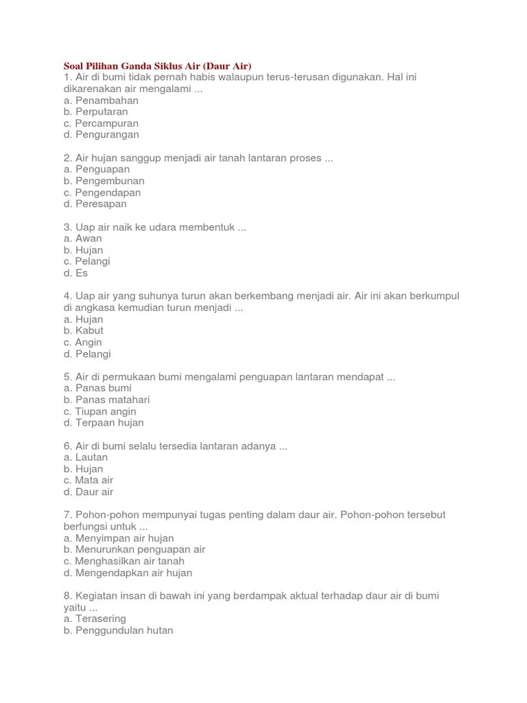 Soal ipa tentang daur air (tema 8) by diyah2ayu2budi2lesta. Sumber daya alam seperti tanah, air, batuan, dan mineral, termasuk dalam kategori. Soal geografi kelas xi bab 3 sebaran dan pengelolaan sumber daya. Bank soal merupakan media berbagi literatur berbagai jenis soal, baik dari lingkungan sekolah (sd, smp, sma, smk) ataupun umum seperti cpns, p3k . Berilah tanda silang (x) huruf a, b, c, d, atau e pada jawaban yang paling benar !